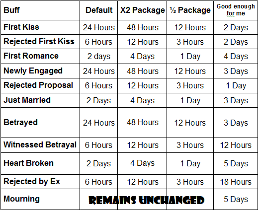 When my Sims partner died a couple of days ago I was absolutely gutted at the appalling short amount of time that she spent grieving for him, and even more struck that their kids seemed only to care that their father was dead for about 2 days. Seeing as I usually play on long life span I found this a little bit annoying so I decided to make a mod to fix this, and many other buffs that I reckon should've been longer. For instance I thought that if you're remembering your First Kiss for 1 day then you should probably remember that you were rejected from your first kiss for the same amount of time (to be fair, in real life I would probably remember for A LOT longer if I got rejected than if I were kissed)