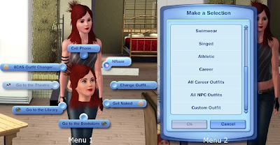 This is a script that adds a "XCAS Outfit Changer..." menu item to all human sims toddler and above. It will change them into all their usual outfits, plus Singed and SkinnyDippingTowel, and has options to change them into your choice of Career outfits and of NPC outfits, plus others such as custom ones as long as you know the name or TGI of the outfit. All changes are without the spin.