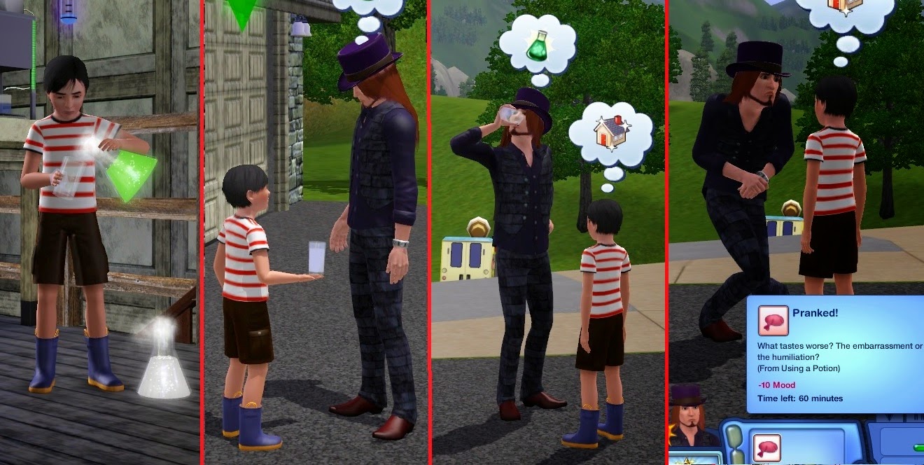 With Generations, your sims could make potions on the chemistry set and mix them into "mysterious drinks" for other sims to drink, but there was no way to get a specific sim to actually drink it unless you directed them to which you can't with inactives. Apparently we are expected to just leave the "mysterious" drink out in the open and wait and hope for a sim to eventually come up and drink it, but there's never any guarantee of it happening (Ironically the only time I've seen it happen was while I was testing this mod). Hence this mod, that adds a Bring Potion To... interaction to these mysterious drinks that lets your sims hand potions directly to a targeted sim to drink.