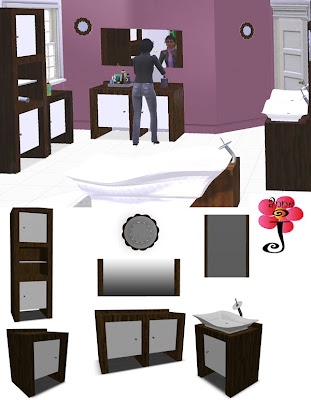 Set includes: 2 end tables, sideboard, mirror, tub, sink, plant, 2 wall towels, 5 deco