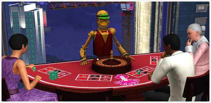 What happens when you add poker and roulette to slots and blackjack? An explosion of gambling goodness! The Lucky Simoleon Casino already contains the Hit 'em Harder Blackjack Table and the Triple Riches O' Jackpots Slot Machine, but now you can add two brand new games for your Sims to play! Dead Man's Hand Poker and Let it Ride Roulette will round out your casino offerings and satisfy any Sim's desire to place a bet. Ante up!